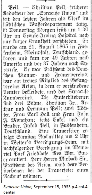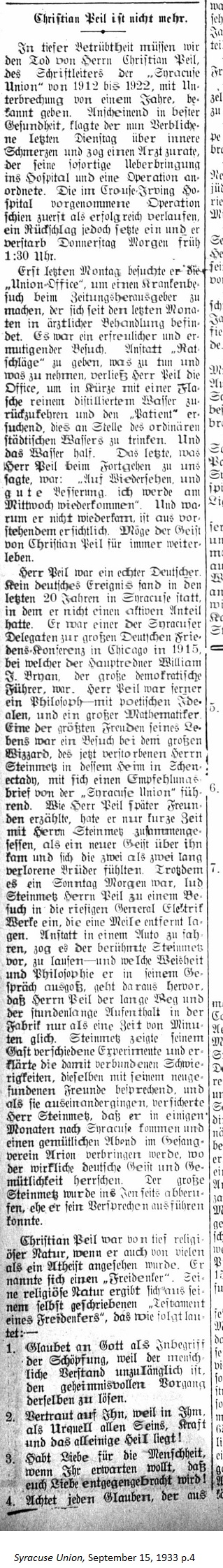 September 15, 1933 page 4 _____ With great sorrow we must announce the death of Mr. Christian Peil, the editor pf the Syracuse Union from 1912 to 1922 with a break of one year. Seeming in the best of health, the now pale man complained of an internal pain last Tuesday. He consulted a physician, who brought him immediately to the hospital and scheduled an operation, which was performed in the Crouse-Irving Hospital and at first seemed to go well. Then a setback occurred and he died Thursday morning at 1:30 AM. Just last Monday he visited the Union office to pay a sick call on the newspaper publisher, who has been under doctor care since last month. It was a amicable and heartening visit. Instead of giving advice on what to do and what to take, Mr. Peil left the office briefly and returned with a bottle of pure, distilled water and requested the patient drink it in place of the ordinary city water. And the water helped. The last thing Mr. Peil said to us as he left was, "Goodbye, and feel better. I'll come back on Wednesday." And why he didn't return is clearly apparent. May the spirit of Mr. Peil live on forever. Mr. Peil was a true German. No German event occurred in Syracuse over the last twenty years in which he had not participated. He was a Syracuse delegate to the grand German Peace Conference in Chicago in 1915, where the main speaker was William J. Bryan, the great leader of the Democrats. Furthermore Mr. Peil was a philosopher with poetic ideals and fine mathematician. One of the greatest pleasures in his life was a visit with the great wizard, the late Mr. Steinmetz, to his home in Schenectady carrying a letter of recommendation from the Syracuse Union. As Mr. Peil later related to friends, he only sat for a short amount of time with Mr. Steinmetz when a new spirit came over them and the two felt like long lost brothers. Although it was Sunday morning, Steinmetz invited Mr. Peil to a visit in the enormous General Electric factory, which was a mile away. Instead of driving in a car the famous Steinmetz preferred to run — and such wisdom and philosophy poured out of him as he spoke — that Mr. Peil equated the long distance and the hour long stay in the factory as but a mere minute. Steinmetz showed his guest various experiments and explained the degrees of difficulty involved with each of them with his new found friend, and as they left Mr. Steinmetz assured that in a few months he would come to Syracuse and spend a pleasant evening in the Arion Song Hall, where true German spirit and hospitality prevailed. The great Steinmetz was called away to the other side before he could fulfill his promise. Christian Peil had a very religious nature although to many he looked like an atheist. He called himself a "free thinker." His religious nature is demonstrated in the "Testament of a Free Thinker," which he wrote himself: