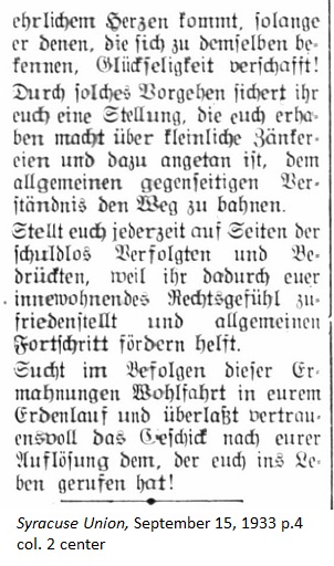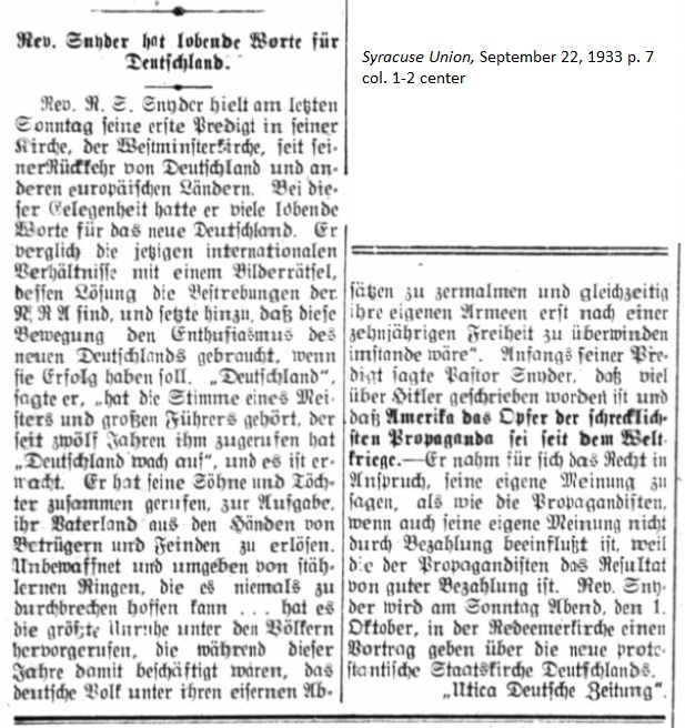 September 22, 1933 page 7 _____ Last Sunday Rev. R.E. Snyder held his first sermon in his church, the Westminster Church, upon returning from Germany and other European countries. On this occasion he had many words of praise for the new Germany. He compared the current international relationships with a picture puzzle, whose solution requires the efforts of the NRA (National Recovery Administration.) He added that this movement needs the enthusiasm of the new Germany if it is to have success. "Germany," he stated, "has the voice of a masterful and great leader, who has been saying for twelve years 'German, wake up!.' Now it has awakened. He has called his sons and daughters together and given them the task to rescue their fatherland from the hands of liars and enemies. Unarmed and surrounded by steel rings, which one can never hope to break ... it brought forth great unrest among the people, who this year were busy crushing the German population under their iron heels while at the same time putting their own armies in a position for conquering after a decade of liberty." At the beginning of his sermon Pastor Snyder said that many things have been written about Hitler and that America has been the victim of dreadful propaganda since the World War. — He took the liberty to speak his own mind just as the propagandists have done, even if his own opinion is not influenced by financial gain while propaganda is the result of payments. Rev. Snyder will give a lecture at Redeemer Church on Germany's new Protestant State Church on Sunday evening, October 1st. Utica Deutsche Zeitung |