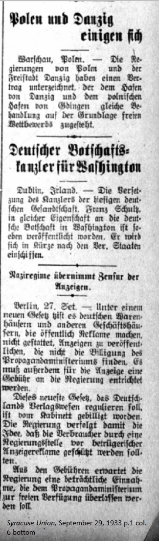September 29, 1933 page 1 _____ Warsaw, Poland. — The governments of Poland and the Free City of Danzig have signed an agreement, which grants the harbor at Danzig and the harbor at Gdynia equal treatment on the principle of free trade competition. German Embassy Chancellor for Washington _____ Dublin, Iteland. — The transfer of the Chancellor of the local German Legation, Franz Schultz, to head a similar position at the German Embassy in Washington has just been announced. He will sail to the United States in the near future. Nazi Regime takes over Censorship of Advertising _____ Berlin, September 27th. — Under a new law German department stores and other businesses which place public advertisements may not publish them until they are approved by the Propaganda Ministry. Additionally there will be a fee which must be paid to the government for advertisements. This new law, which will regulate all Germany's advertising, is approved by the Cabinet. The government pursued the idea that consumers should be protected from deceptive advertising through legislation. The government expects a substantial income from the fee, which will be turned over to the Propaganda Ministry for various purposes. |