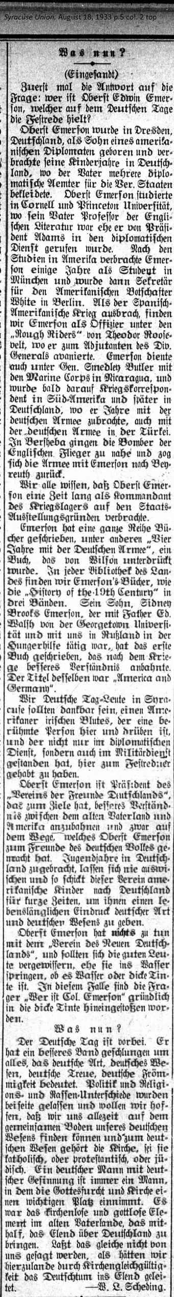 We German Day people in Syracuse should be thankful to have had a festival speaker who is an American of Irish blood, and who is famous here and over there not just for his diplomatic service but also his military service. Colonel Emerson is President of the Association of Friends of Germany, whose goal is to create better understanding between the old fatherland and America in the way in which Colonel Emerson has become a friend of the German people. Years of youth spent in Germany are never swept away, so this association sends its American children to Germany for a short period of time to give them a lifelong impression of German nature and character. Colonel Emerson has nothing to do with the "Verein des Neuen Deutschlands" (Association of New Germany) and good people should make sure that before they jump into the water they check to see if it is water or thick ink. In this instance those who ask the question "Who is Colonel Emerson" are basically thrown into the thick ink.* [* Not sure if Pastor Scheding was referring to rumors of Emerson's political agenda, but four months later an article was published concerning it. See The Jewish Telegraphic Agency article of December 3, 1933 for "Colonel Edwin Emerson Denies He is Official Spokesman for the Nazi Party in America."] — W.L. Scheding. |