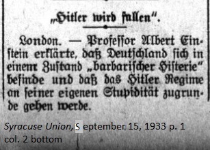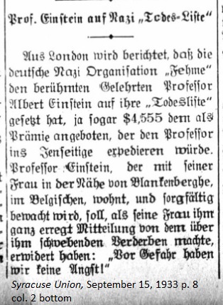 September 15, 1933 page 8 _____ It's reported in London that the German Nazi Organization "Fehme" has placed famous scholar Professor Albert Einstein on its "Death List," offering a reward of $4,555 to anyone expediting the Professor's departure to the next realm of existence. Professor Einstein lives with his wife near Blankenberge, Belgium and they are being carefully guarded. When she anxiously told him about the report of his impending doom he responded, "We have no need to be afraid of danger!" |