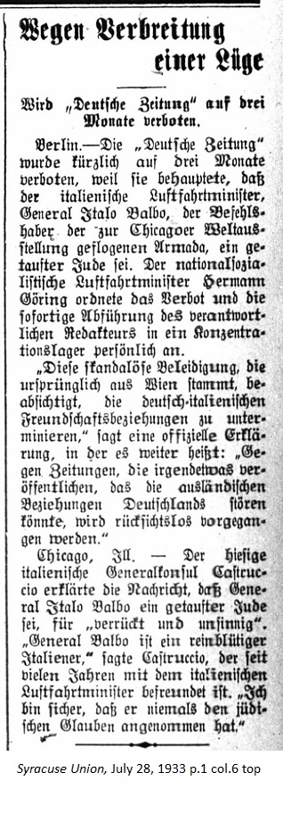 July 28, 1933 page 1 _____ The Deutsche Zeitung (German Newspaper) was recently banned for three months because it maintained that the Italian Air Force Minister, General Italo Balbo, Commander of the Armada flown to the Chicago World Fair, was a converted Jew. The National Socialist Air Force Minister, Hermann Göring personally ordered the ban and the immediate evacuation of the responsible editor to a concentration camp. "The scandalous slander, which originated in Vienna, was intended to undermine German-Italian friendly relations," said an official declaration. It was further stated, "We will ruthlessly take action against newspapers, which could disrupt Germany's foreign relations." Chicago, Ill. — The local Italian Consulate General Castruccio stated the report that General Italoo Balbo is a converted Jew is "insane and nonsense." General Balbo is a pure-blooded Italian," he stated. For years Castruccio has been on friendly terms with the Italian Air Force Minister. "I am certain that he has never assumed the Jewish faith." |