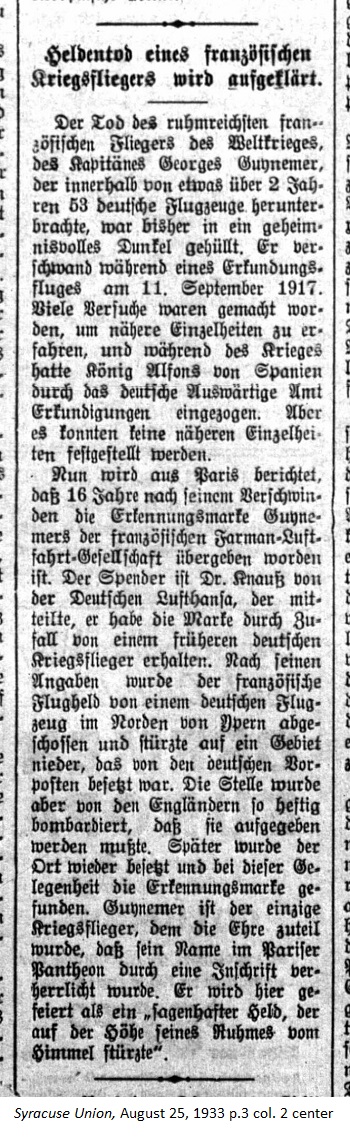 August 25, 1933 page 3 _____ The death of the famous World War French pilot, Captain Georges Guynemer, who in somewhat over 2 years brought down 53 German aircraft, was until now covered in secrecy. He disappeared during a reconnaissance flight on September 11, 1917. Many attempts were made to learn details and during the War King Alfons of Spain gathered reports through the German Foreign Office, however no clearer information was ascertained. Now it's reported from Paris that 16 years after his disappearance, Guynamer's identification tag have been handed over to the French company, Farman Aviation Works. The donor is Dr. Knauss of German Lufthansa, who communicated that he received the tag by accident from a former German war pilot. According to his information the French aviation hero was shot down by a German aircraft north of Ypres and crashed into a region held by a German outpost, however the place was so heavily bombed by the English that they had to withdraw from it. Later the region was reoccupied and during that occasion the tag was found. Guynemer is the only wartime pilot given the honor of having his name magnificently inscribed in the Parisan Pantheon. He was celebrated as a "legendary hero, who at the height of his fame crashed down from the sky." |