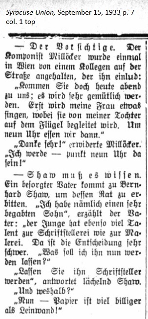 September 15, 1933 page 7 — The Prudent Man. One time in Vienna composer Millöcker met a colleague on the street, who invited him to his house that evening.