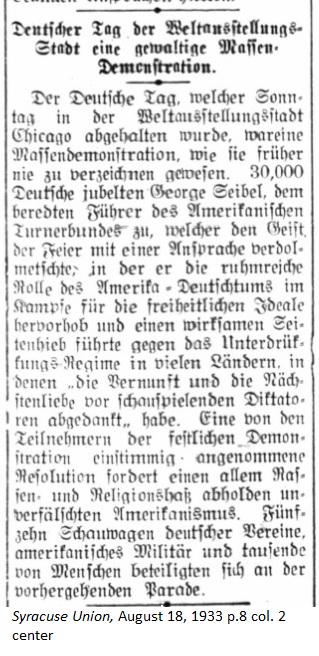 August 18, 1933 _____ The German Day celebration held in Chicago at the World Fair included a mass demonstration in numbers never seen before. 30,000 Germans cheered George Seibel, the eloquent leader of the American Gymnastics Society, as he explained the meaning behind the celebration in a translated speech which extolled the role of America's German community in the fight for liberal ideals and a effective potshot against the oppressive regines in many countries in which reason and neighborly love may have resigned in the face of theatrical dictators. One of the participants in the festival demonstration suggested a resolution, which was unanimously accepted, calling for the rejection of all forms of racial and religious hatred as unamerican. Fifteen show wagons from German associations, the American military, and thousands of people participated in the preceding parade. |