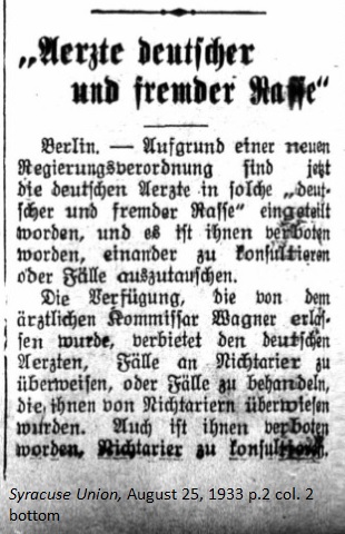 August 25, 1933 page 2 _____ Berlin. — Because of a new government regulation, German doctors have been divided into "German and foreign races" and they are forbidden to consult one another or swap cases. The regulation, which was enacted by Medical Commissioner Wagner, forbids German doctors from conferring on cases of non-aryans or to treat cases which are referred to them by non-aryans. They are also forbidden from consulting with non-aryans. |