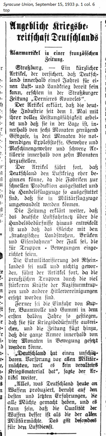 September 15, 1933 page 1 _____ Alarming Article in French Newspaper The article states that German industry has been working since May 1st at full capacity and is in a position to manufacture enough poison gas in six months; necessary explosives, guns and machine guns in three months; and heavy artillery within ten months. The articles goes on to say that Germny could begin a war by air even sooner since factories are already established for rapid production and commercial aircraft can be changed for military use. The newspaper further states that the German aviation network has been thoroughly developed based on commercial needs for strategic mapping of roads, bridges and railways and can be used for troop movements. The demilitarization of the Rhineland has become null and void, the article continues, since Prussian troops have been replaced by much stronger forces of Nazi Storm Troopers and other Hitler organizations. Furthermore the import of copper, cotton, and rubber has increased so much in the first half of the year that they are available for wartime necessities. The newspaper adds that the entire army could be set in motion within four months. "Germany has an incalculable head start beyond all other military forces because it has no outdated war materielle," the article further states. "Everything which Germany produces today in weaponry is based on the best and latest data accumulated by other military powers and it may be that the quality of the weaponry is better than the old military establishments. That goes especially for flight service. |