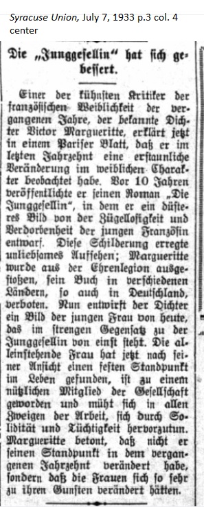 July 7, 1933 page 3 _____ One of the boldest critics of the past year, the well-known author Victor Margueritte, stated today in a Parisian newspaper that he has observed an amazing change in the female character over the past decade. Ten years ago he published his novel, The Bachelor Girl [La Garçonne], in which he created a somber picture of the licentiousness and depravity of young French women. The narrative created a disagreeable sensation. Margueritte was cast out of the Legion of Honor; his book was banned in various countries, including Germany. Now the novelist paints the picture of the young woman of today, the direct opposite to the Bachelor Girl back then. The unmarried woman of today, in his opinion, has discovered a firm point of view in life, has become a useful member of society, has found work in all fields of employment, and has distinguished herself by her solidarity and competence. Margueritte emphasizes that his opinion of ten years earlier has not changed. Instead, women seem to have changed much more favorably. |