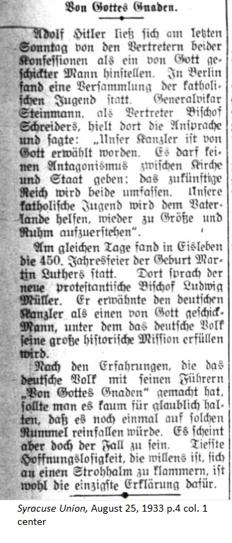 August 25, 1933 page 4 _____ Last Sunday Adolf Hitler allowed himself to be described by the representatives of both confessions as a man sent by God. In Berlin there was an assembly of Catholic youth. Vicar General Steinmann gave a speech there and said, "Our Chancellor was chosen by God. There can be no antagonism between the Church and the State. The future empire embraces both. Our Catholic youth will help the fatherland to once again become grand and glorious." On the same day in Eisleben the 450th anniversary celebration of Martin Luther's birth took place. There newly appointed Bishop Ludwig Müller spoke. He referred to the German Chancellor as a man chosen by God, under whom the German people will fulfill their great historical mission. After the past experiences which the German people have had with their leaders chosen "by God's grace," one should scarcely think it's credible they would fall for such nonsense, but that seems to be the case. The deepest dispair is the only possible explanation for clutching at straws. |