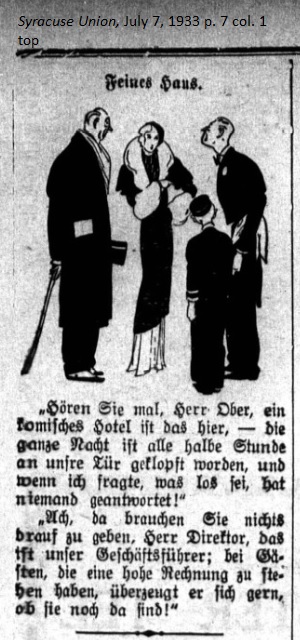 July 7, 1933 page 7 "Tell me, Mr. Concierge. You have a funny hotel here. All night long, every half an hour, someone knocked at our door, but when I asked, 'who's there?' nobody answered."