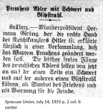 July 14, 1933 page 2 _____ Kolberg. — President Minister Hermann Göring, Reich Chancellor Hitler's right-hand man, recently said at a meeting that Prussia's coat of arms should be changed. The current Prussian eagle with open talons should now hold a sword in one claw and lightning bolts in the other as a symbol of peace and a warning to enemies. |