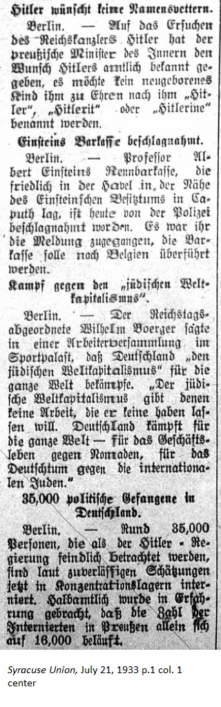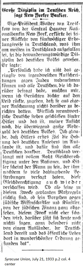 July 21, 1933 page 2 _____ Vice-President Walter von Treskow of the Central Hanover National Bank in New York on his return from a five-week vacation trip to Germany said that what impressed him the most was the marvelous discipline of the German people. "Personally I didn't perceive the slightest sign of outrages against the Jews and all Germans, whom I asked about it and told about the rumors, had to admit to me that they had nothing to report. In reality responsible Germans stand resolutely behind Hitler, and in my opinion this is the overwhelmingly large majority of Germans. I believe that Hitler's first goal is the elevation of the German reputation abroad, and for that all Germans are grateful. Germany justifiably desires equal rights among other nations and Hitler seems to be the man to regain parity after so may failed endeavors. Whether all the planned measures to accomplish his goal is justified, whether his procedures against Jewish scientists and artists along with the entire Jewish financial system does more harm than good we cannot tell today, at least not foreigners who traveled in Germany and found that public life there is in marvelous order." |