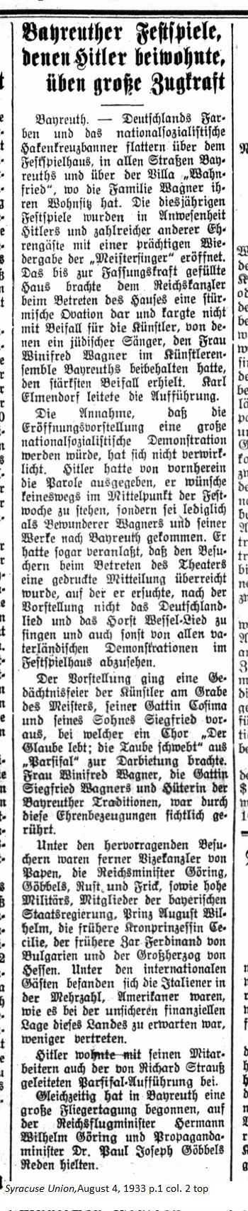 August 4, 1933 page 1 _____ Bayreuth. — German's colors and the National Socialist Swastika banners fluttered over the festival house, in all the streets of Bayreuth, and above the villa "Wahnfriend," where the Wagner family has its residence. This year's festival was opened in the presence of Hitler and countless other guests of honor with a magnicient performance of the "Meistersinger." The house was filled to capacity and when the Reich Chancellor entered he was greeted with a thunderous ovation and it did not spare enthusiastic applause for the artists, including a Jewish singer retained in the Bayreuth Artists Ensemble by Mrs. Winifred Wagner. Karl Elmendorf conducted the performance. The assumption that the opening performance would become a large National Socialist demonstation did not materialize. Hitler had given a speech prior to the opening stating that he in no way wished to be the center of attention during Festival Week. He would only come to Bayreuth as an admirer of Wagner and his work. He had a printed notice handed out to visitors as they entered the theater requesting they refrain from singing the Deutschlandlied (Germany Song) and the Horst Wessel song after the performance and refrain from fatherland demonstrations in the Festival House. A commemorative ceremony by the artists precedednel, members og the the performance at the grave of the maestro, his wife Cosima, and his son, Siegfriend. A choir performed "Der Glaube lebt; die Taube schwebt" (The faith's alive; the doves soar by) from "Parsifal." Mrs. Winifred Wagner, the wife of Siegfried Wagner and protector of the Bayreuth traditions, was visibly moved by the show of respect. Among the illustrious visitors were Vice-Chancellor von Papen; Reich Ministers Göring, Rust and Frick; plus high military personnel, members of the Bavarian State government, Prince August Wilhelm, former Crown Princess Cecilie, former Tsar Ferdinand of Bulgaria, and the Grand Duke of Hessen. Among the international guests Italians made up the majority; Americans were less represented, as can be expected with the uncertain financial situation of this country. Hitler and his co-workers also attended the Parsifal performance conducted by Richard Strauss. At the same time in Bayreuth a huge aviation conference began at which Reich Aviation Minister Hermann Wilhelm Göring and Propaganda Minister Dr. Paul Joseph Göbbels gave addresses. |