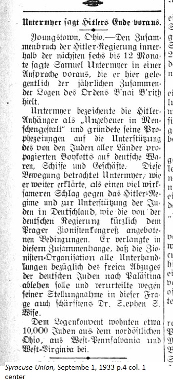 September 1, 1933 page 4 _____ Youngstown, Ohio. — In a speech given at the annual meeting of the lodges of the Order of B'nai B'rith, Samuel Untermyer predicted the dissolution of the Hitler government within the next 6 to 12 months. Untermyer referred to Hitler's supporters as "monsters in human form" and based his prophecy on the support for the advertised boycott of German wares, ships and businesses by the Jews of all countries. Untermyer further explained that this movement would be a very effective blow to the Hitler regime and a support to the Jews in Germany as they were recently laid out at the Prague Zionist Congress.* In relation to this he demanded that the Zionist organization refuse to deal with any negotiations for the unhampered migration of all German Jews to Palastine and sharply criticized Dr. Stephen S. Wise for his position. Around 10,000 Jews from northest Ohio, west Pennsylvania and West Virginia attended the lodge conference. _____ |