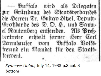 July 14, 1933 page 8 — Buffalo will send Dr. Gustav Hitzel, Deputy Grand Bard of the German Order of the Harugari, and Samuel Rautenberg as delegates to the founding ceremony for the State Association. Furthermore Mr. Carl Dannhuser of the Buffalo Volksfreund will represent the press at the State Convention. |
