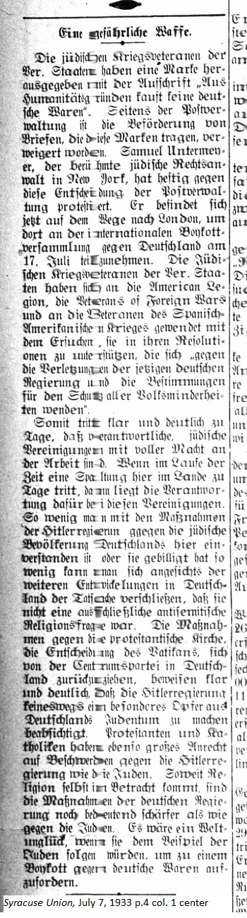 July 7, 1933 page 4 _____ The Jewish War Veterans of the United States have produced a stamp with the inscription "For Humanitarian Reasons do not buy German Goods." The Post Office has refused to forward mail bearing these stamps. Samuel Untermeyer, the well-known Jewish lawyer in New York, has vehemently protested against the Postal authorities for their decison. He's now on his way to London in order to take part in an international boycott rally in Germany on July 17th. The Jewish War Veterans of the United States have turned to the American Legion, the Veterans of Foreign Wars, and the Veterans of the Spanish-American War with a request to support them in their resolution "against the current German government's violation of the stipulations for protection of all minority populations." Thus it is clearly and meaninfully brought to light that responsible Jewish organizations are fully empowered to perform their work. When in the course of time a schism is apparent within the country, these organizations have the responsibility to act. So little is agreed upon regarding the steps taken by the Hitler regime against the Jewish population in Germany or at least so little is acknowledged that one closes onself off to the issues developing in Germany, that they are not exclusively antisemitic religious issues. Measures taken against the Protestant Churchs, the decision of the Vatican to withdraw from the Central Party in Germany, clearly prove that the Hitler government in no way intends to make Germany's Jewish population the only victim. Protestants and Catholics have just as much right to complain about the Hitler government as the Jews. As far as religion is concerned, the measures taken by the German government are significantly more encompassing than just against the Jews. It might be a worldwide catastrophe if Protestants and Catholics were to follow the example of the Jews and request a boycott against German goods. |