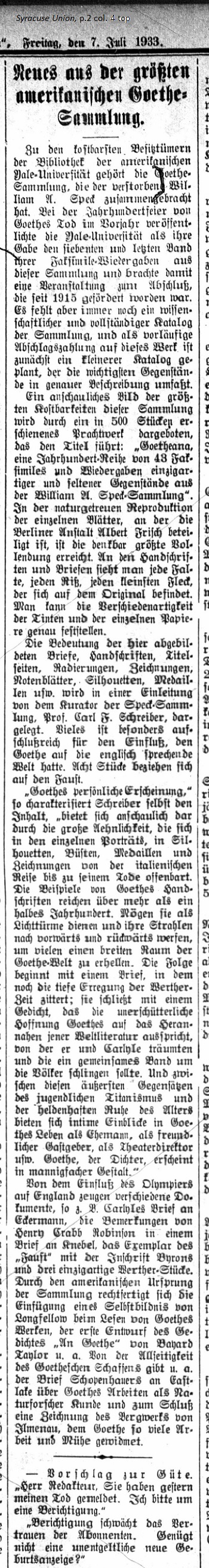 July 7, 1933 page 2 _____ Among the costliest possessions of the library at the American Yale University is the Goethe Collection, which was assembled by the late William A. Speck. Last year during the centennial commemoration of Goethe's death, Yale University published its edition of the seventh and final volume of facsimiles reproductions from the collection, thus bringing the project, started in 1915, to a close. However a scholarly and complete catalog of the collection is still lacking. A preliminary installment is planned in the form of a smaller catalog containing the most important subjects in detailed description. A clear indicator of the precious nature of this collection is presented in this magnificent work titled Goetheana; a centenary portfolio of forty-three facsimiles & reproductions of unique or rare items from the William A. Speck collection. Five hundred copies were published. In the true-to-nature reproduction of the individual specimens, in which the Berlin establishment of Albert Frisch participated, the greatest possible precision was achieved. In the manuscripts and letters one sees each fold, each tear, the tiniest blemish contained in the original. One can see variations in ink and paper. The significance of the imaged letters, manuscripts, title pages, etchings, drawings, sheet music, silhouettes, medals, etc. will be presented in the introduction by the curator of the Speck Collection, Prof. Carl Schreiber. Much is revealed especially on the influence which Goethe had on the English-speaking world. Eight pieces relate directly to Faust. Thus Schreiber himself characterizes the content. "Goethe's own appearance is featured vividly through likenesses in individual portraits, silhouettes, busts, medals and drawings from the Italian Journey right up to his death. Goethe's manuscripts span more than half a century. May they serve as beacons, casting their rays forward and backward to illuminate the broad spectrum of the Goethe world. The series begins with a letter in which the intense excitement of Werther's era still vibrates. It closes with a poem, which expresses Goethe's unwavering hope for the approach towards a world literature as he and Carlyle dreamt of it and which would encompass the people of the world in a common bond. Between the poles of youthful Titanism and the heroic calm of old age we get an insight into Goethe's life as a husband, a friendly host, a theater director, etc. Goethe the poet appears in multiple personnae." Many documents display the influence of the Olympian on England, such as Carlyle's letter to Eckermann, the remarks of Henry Crabb Robinson in a letter to Knebel, the copy of Faust with an inscription by Byron, and three unique Werther pieces. The American roots for the justification of the collection include a self portrait by Longfellow reading from Goethe's works, the first draft of the poem "To Goethe" by Bayard Taylor, et. al. Concerning the universality of Goethe's creations we have, among other things, Schopenhauer's letter to Eastlake on Goethe's studies as a patron of the natural sciences, and in closing, a drawing of the Ilmenau mine, to which Goethe dedicated so much work and effort. "Mr. Editor, Yesterday you published an announcement of my death. Please print a retraction." "A retraction would harm the subscribers' trust in the newspaper. Wouldn't it suffice to print a new birth announcement free of charge?" _____ [Translator's Note: the catalog record for this collection is available at https://orbis.library.yale.edu/vwebv/holdingsInfo?bibId=9448389