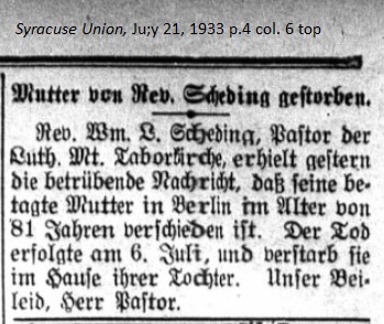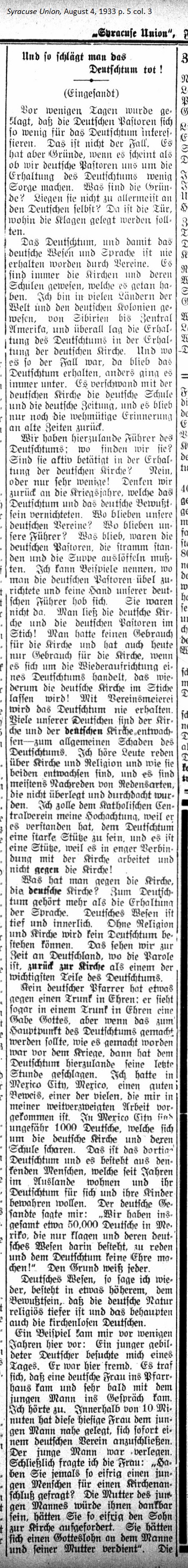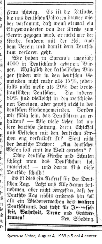 August 4, 1933 page 5 _____ (Sent in) A few days ago there was a complaint that the German pastors had little interest for the German community. This is not the case. However there are reasons that it seems as though we pastors seldom involve ourselves in its affairs. What are the reasons? Don't they lie in the Germans themselves? There is the door wherein the accusation should be based. The German community and with it the German character and the language, are never preserved through organizations. It's always been the churches and their schools, which have accomplished this. I have been in many countries of the world and the German colonies, from Siberia to Central America, and throughout it all the preservation of the German community lies in the preservation of the German Church. And where this was the case, the German community survived. Where is was otherwise, the German community always went under. German schools and German newspapers dissappeared with the German Church and all that remained were painful memories of the old times. Here at home we have leaders of the German community. Where do we find them? Are they active in the preservation of the German church? No, or only slightly! Shall we think back on the war years, which annihilated the German community and the German conscience? Where were our organizations? Where were our leaders? What remained were the German pastors who stood tall and had to spoon out the soup. I can cite examples where people punished the pastors yet not a hand belonging to our leaders was raised. They were not there. People left the German Church and the German pastors in a lurch. People only had need for the Church when it came to the restoration of a German community, which once again left in a fix. The German community was not preserved with a host of organizations. Many of our Germans have grown away from the Church and the German churches — to the overall detriment of the German community. I hear people speak about the church and religion and how they have grown away from both of them, and it's mostly been malicious talk that hasn't been reflected upon and thought out. I bestow my respect upon the Catholic Central Association because it understood how to be a strong support to the German community and it is a support because is works in close association with the church and not against it! What do people have against the church, the German Church? There's more to the German community than the preservation of the language. German character is deep and introspective. Without religion and the church there could be no German community. We see that at this time in Germany, where the slogan is return to church as one of the most important parts of the German community. No German pastor has anything against a drink to honor; in a drink to honor he sees a gift from God, but when it's made the main issue of the German community, as it was before the war, then it's the final hour for the German community in this country. During my far-reaching work I came across a good piece of evidence, one of many, in Mexico City, Mexico. There are around 1000 Germans in Mexico City who rally around the German churches and their schools. They comprise the local German community, thinking individuals who have lived for years in a foreign land and want to preserve their community for themselves and their children. The German envoy told me, "We have in total around 50,000 Germans in Mexico, who only complain and whose German nature consists only of talking and doing nothing of honor for the German community!" Everyone knows the reason. German character, I say again, consistes of something highter, a consciousness that the German nature is more deeply religious and even churchless Germans maintain that. An example came to me a few years ago. A young, educated German visited me one day. He was a stranger here. It happened that a German woman came into the parish house and very soon after the young man was conversing with her. I listened. Within 10 minutes this local woman suggested to the young man that he immediately join a German association. The young man was embarrassed. Finally I asked the woman, "Couldn't you have just as eagerly asked the young man to join a church? The young man's mother would be grateful to you if you had recommended a church to her son. You would have earned a heavenly reward for yourself, the young man, and his mother." The woman fell silent. It is a fact that we German pastors always think of that whenever an immigrant wants to move from a church to an association. He not only loses the church but in time the association and thus the German community. In Syracuse we have approximately 4000 citizens, who were born in Germany. Subtracting the Catholic citizens we find in the German congregations count for no more than 15 percent of the German citizens of who no more than 20 percent are Protestant Germans. The other 80 percent are perhaps in the various association, but certainly not in the German church congregations. Will we ba capable of perserving our German community? — How many readers does our German newspaper have? Are their fates firmly connected with the German churches? Doesn't the German poet [Emanuel Geibel] say, "German character shall heal the world"? Without German churches and schools the German community will be beaten to death. It will be cold and dead! — and so many Germans will be guilty! This is a wake-up call for German Day. Let's all participate, but don't forget that German Day should be nothing other than a reawakening of the German community to self-awareness, truth, loyalty and trust in God! Rev. Scheding. _____