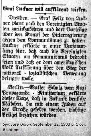 September 22, 1933 page 1 _____ Dresden. — Count Felix von Luckner plans to return to the United States and conduct lectures on the Hitler government's fight against Communism. Lucker declared at a meeting here that the United States is also threatened by Communism and that he wishes to bring the American people information on the National Socialist Movement's victory over it. |