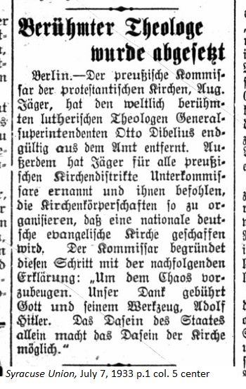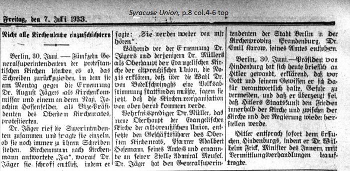 July 7, 1933 page 8 _____ Berlin, June 30th. — Fifteen General Superintendents of Protestant Churches have declined to withdraw the letter in which on Monday they protested the appointment of Dr. August Jäger as Church Commissioner and another Nazi, Joseph Hossenfelder as Vice-President and the Superior Church Council. Dr. Jäger called the superintendents together and asked them individually whether they would stand by their letter. Churchman after churchman responded "Yes," whereupon Dr. Jäger gruffly dismissed them saying, "You will hear from me again." Before the appointment of Dr. Jäger and that of Dr. Müller as Head of the Evangelical Church of the Old Prussian Union, the Nazis said that a popular vote had to precede the election of Dr. von Bodelschwingh. Now they're saying tha the Church reorganization will come from the top on down. Military District Pastor Dr. Müller, the new head of the Evangelical Church of the Old Prussian Union, fired the managing director of the Superior Church Council, Pastor Adalbert Hosemann and appointed Admiral Meusel to take his place. Dr. Jäger relieved the General Superintendent of Berlin in the Church District of Brandenburg, Dr. Emil Karow, from his post. Berlin, June 30th. — President von Hindenburg related in a letter to Hitler that before God and his conscience he hold himself responsible for avoiding trouble and that he is convinced that Hitler's statesmanship will again bring peace within the Church and between the Church and the government. Hitler immediately responded to Hindenburg's request and commissioned Dr. Wilhelm Frick, Minister of the Interior, to act as mediator. |