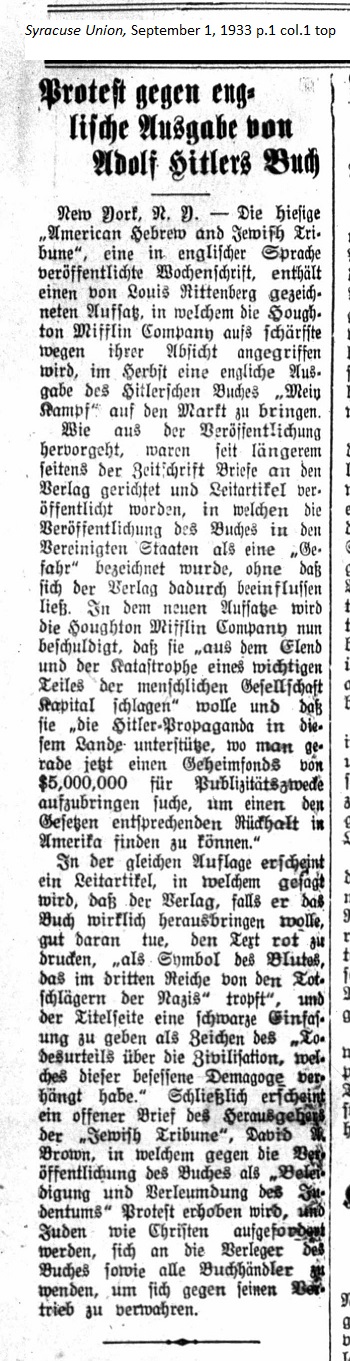 September 1, 1933 page 1 _____ Mew York, N.Y. — The local American Hebrew and Jewish Tribune, an English-language weekly periodical, has an article by Louis Rittenberg in which the Houghton Mifflin Company was sharply criticized for its intention to bring out an English edition of Hitler's book, Mein Kampf, to market. There was a long series of letters by the periodical directed at the book publisher and a lead article was posted in which the publication of the book in the United States was called a "threat," however the publisher was not influenced by it. In a new article the Houghton Mifflin Company was indicted for wanting to "capitalize on the misery and the catastrophe of a significant section of humanity" and "support Hitler propaganda in this country, where people are trying to raise private funds of $5,000,000 in order to find legal support in America." In the same edition a lead article appears in which it is stated that in the event the publisher really does bring out the book, it would do well to print the text in red "as a symbol of the blood shed in the Third Reich by Nazi murderers," and the title page should be bordered in black as a sign of the "death sentence this obsessed deagogue has placed on civilization." Finally a public letter was issued by the publisher of the Jewish Tribune, David A. Brown, in which protest was raised against the publication of the book for "insult and slander of the Jewish people" and called upon Jews and Christians to turn their backs towards the publisher and all book handlers in order to protest against its marketing. |