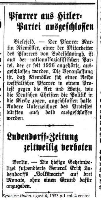 August 4, 1933 page 1 _____ Bielefeld. — Pastor Martin Niemöller, one of the co-workers of Pastor von Bodelschwingh, has been expelled from the National Socialist Party, to which he has belonged since 1926. The reason is that Niemöller joined a group of Westfalian pastors in a protest against the ways and means in which the German Christian [Party] brought politics into the church. Other signers of the protest may also soon be expelled. Ludendorff Newspaper temporarily banned _____ Berlin. — The local secret police suspended General Erich Ludendorff's Volkswarte (People's Viewpoint) for three months without given a reason for it. |