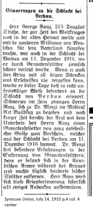 July 14, 1933 page 8 _____ Mr. George Ranz of 215 Douglas St., who at the time of the World War still lived in the old homeland and was compelled to fight for his fatherland along with a million other men, was also at the Battle of Verdun on December 11, 1916 where he was seriously wounded by a granade fragment. And since he can never forget the War with all its horrors, on this day he involuntarily thinks back on the Battle of Verdun. A pain in his leg forced Mr. Ranz to go to Dr. Menzi in the Medical Arts Building and soon afterwards the doctor removed a granade fragment of considerable size from Mr. Ranz's lower leg, which he received on December 11, 1916 at the Battle of Verdun. Dr. Menzi had specific experience in the removal of granade fragments since he was in the Canadaian Army during the War and daily removed hundreds of these splinters. Mr. Ranz will surely keep this war memento forever as a souvenir. |