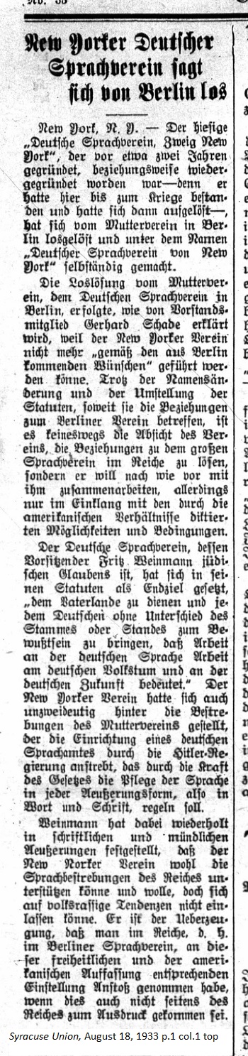 August 18, 1933 page 1 _____ New York, N.Y. — The local "German Language Association, New York Branch" which was founded about two years ago or actually reestablished since it existed until the war at which time it was dissolved, has disassociated itself from the mother association in Berlin and restructured as an independent entity called the "German Language Association of New York." The dissolution from the mother association, the German Language Association in Berlin, as Committee member Gerhard Schade explained, is because the New York association no longer in agreement with wishes coming from Berlin. Despite the name change and the change-over of statutes with regard to the relationship with the Berlin association, it is in no way the intention of the association to dissolve the relationships with the large language association in the Reich. Things will remain the same with regard to cooperative tasks which remain feasibly and permittably in accord with American dictates. The German Language Association, whose chairman, Fritz Weinmann is of the Jewish faith, sets the ultimate goal in the statutes as "serving the fatherland and bringing all Germans without distinction to ancestry or status, to the realization that work on the German language means work towards the German community and the German future." The New York Association has also unequivocally placed itself behind this endeavor of the mother association to regulate the formation of an official German language, for which the Hitler government strives. The power of law should control the usage of language in all forms of oral and written expression. Weinmann has repeatedly emphasized orally and in writing that the New York Association can and will support linguistic efforts by the Reich yet cannot align itself behind the racial purity tendencies. He is convinced that people in the Reich, that is, in the Berlin Language Association, may have taken offense to the liberal American opinion even though it might not have been expressed by the Reich. |