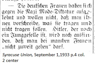 September 1, 1933 page 4 — German women have rebelled against the Nazi fashion edict and do not want men specifying what they can and cannot wear. Hitler, who is still a bachelor, will soon find out that men will not go far with such women. |