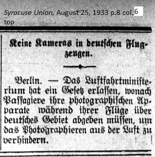 August 25, 1933 page 8 _____ Berlin. — The Air Travel Ministry has enacted a law whereby passengers must surrender their photographic equipment during their flight over German territory in order to hinder photography in the air. |