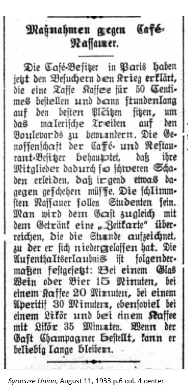 August 11, 1933 page 6 _____ The café owners in Paris have recently declared war on visitors who order a cup of coffee for 50 Centimes and then sit for hours in the best spots to marvel at the pictures being painted on the boulevard. The Association of Café and Restaurant Owners maintains their patrons are harming their businesses so much that something just has to be done. The worst deadbeats are allegedly the students. From now on guests will receive a "time card" at the same time as their drinks on which the time will be marked when they sat down. The amount of time the patron is alloted is as follows: With a glass of wine or beer, 15 minutes; with a coffee, 20 minutes; with an aperitif, 30 minutes; the same amount for a liqueur; and a coffee with liqueur, 35 minutes. If the guest orders champagne, he can stay as long as he likes. |