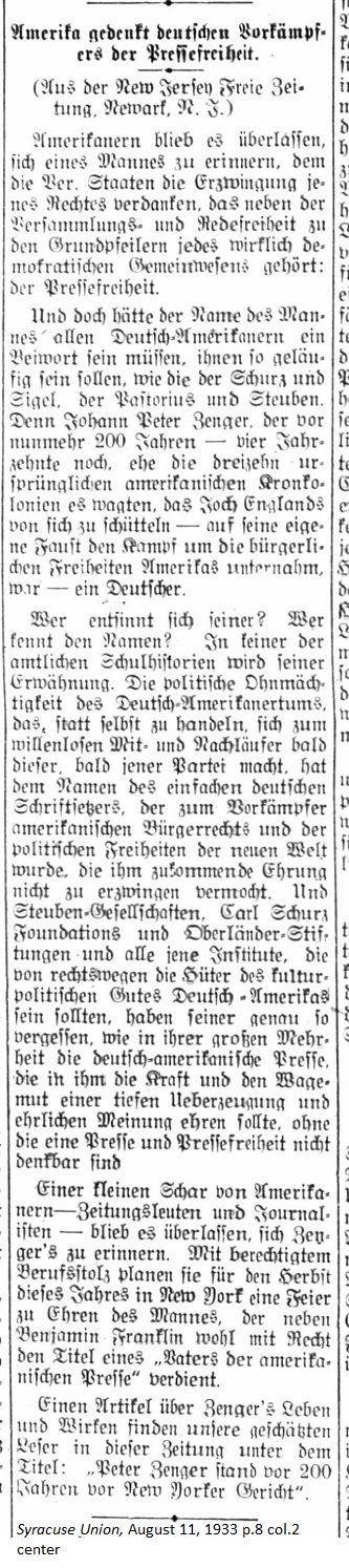 August 11, 1933 page 8 _____ (From the New Jersey Freie Zeitung, Newark, N.J.) And indeed the name of this man must be as familiar to all German-Americans as the names Schurz and Sigel, Pastorius, and Steuben. Johann Peter Zenger, who more than two hundred years ago — four decades before the thirteen original colonies dared to shake off England's yoke — was a German who used his own fist in the battle for America's liberty. Who else recognizes or remembers his name? There's no mention of it in the school histories. The political impotence of the German-American community, which instead of dealing with it on its own has become a group of witless camp followers and devotees of every other political party and forgotten the name of the simple German typesetter who was the champion of American civil rights and political freedom in the New World. And Steuben Associations, Carl Schurz Foundations, the Oberländer Foundation and all other institutions, which are supposed to be the protectors of the cultural and political well being of German Americans, have forgotten him completely along with the majority of the German-American Press. In him we should honor his power, boldness, deep conviction, and honorable intentions without which the Press and Freedom of the Press would not have been considered. A small contingent of Americans — newspaper people and journalists — have made it their task to remember Zenger. With justifiable pride of vocation they plan a celebration in New York in the Fall of this year to honor this man, who rightfully along with Benjamin Franklin deserves to be called "Father of the American Press." Our readers can find an article on Zenger's life and work in this newspaper under the title "Peter Zenger stood 200 years ago before the New York Court." |