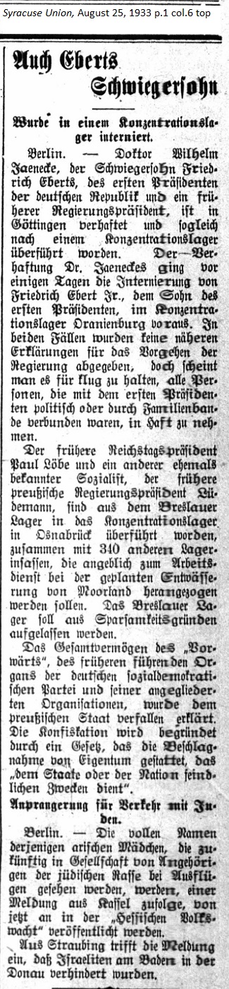 August 25, 1933 page 1 _____ Was Interned in a Concentration Camp Former Reichstag President Paul Löbe and another previously known Socialist, former Prussian President Lüdemann, were transported from Breslau Holding Center to the concentration camp in Osnabruck along with 340 other holding center inmates, who allegedly were being moved for work service in the planned drainage of marshland. The Breslau Holding Center is being closed as a financial savings measure. The total assets of Vorwärts, the former leading periodical of the German Social Democratic Party and its affiliated organizations, were declared forfeit to the Prussian State. The confiscation was based on a law which states property can be confiscated "which serves hostile purposes against the state or the nation." From Straubling comes the report that Israelites were hindered from bathing in the Danube. |