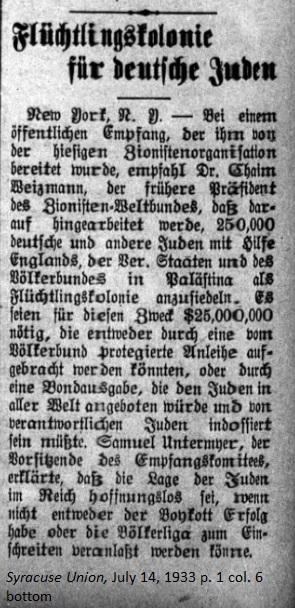 July 14, 1933 page 1 _____ New York, N.Y. — At a public reception hosted by the local Zionist organization, Dr. Chaim Weizmann, former president of the Zionist World League, recommended that work be done to enlist the help of England, the United States and the League of Nations in establishing Palastine as a refugee colony for the 250,000 German and other Jews. $25,000,000 would be needed for this task, which could be either procured as a sponsored loan through the League of Nations or as a bond offered to the Jews throughout the world and endorsed by a responsible Jewish collaborative. Samuel Untermeyer, chairman of the reception committee, declared that the situation of Jews in the Reich is hopeless if either the boycott is unsuccessful or the League of Nations does not intervene. |