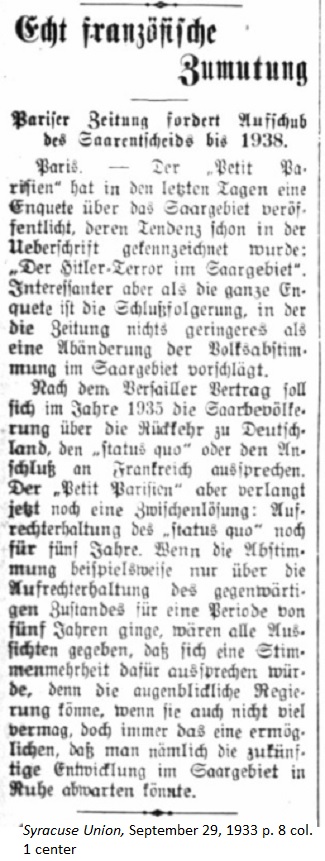 September 29, 1933 page 8 _____ Parisian Newspaper demands Delay of Saar Evacuation until 1938 According to the Versailles Treaty the control over the Saar population is either supposed to be turned over to Germany in 1935, be retained under the "status quo", or be annexed to France. However now the Petit Parisien wants an intermediate solution whereby the status quo is retained for another five years. If the vote, for example, were to adhere to the current status only for a period of five years, all signs would indicate that the majority voted for the extention and the interim government could, even by doing nothing, make it possible to wait out future development in the Saar Region peacefully. |