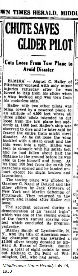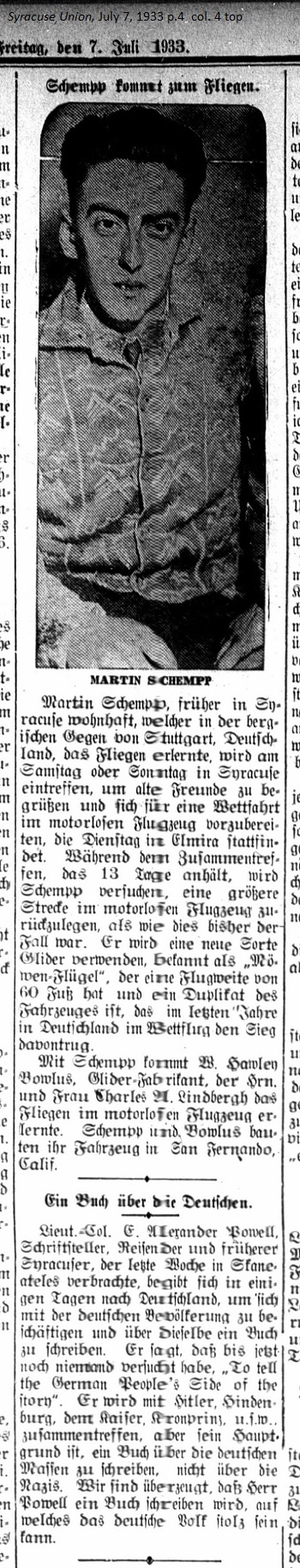 July 7, 1933 page 4 With Schempp comes W. Hawley Bowlus, glider manufacturer, who taught Mr. and Mrs. Charles A. Lindbergh to fly in a motorless aircraft. Schempp and Bowlus built their aircraft in San Fernando, California. _____ [Translator's Note: Martin Schempp didn't win the contest. In an article published in the Middletown Times Herold he had to land when his towline was cut.