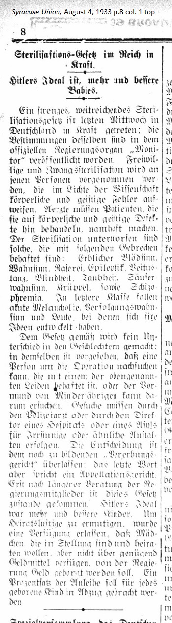 August 4, 1933 page 8 _____ It's Hitler's Ideal — More and Better Babies _____ A strict, wide-reaching sterilization law was enacted last Wednesday in Germany. Its stipulations have been published in the official government organ Monitor. Voluntary and compulsory sterilization will be performed on people, who in the light of science are deemed physically and mentally deficient. Doctors must identify patients they are treating for physical and mental defects. Those subject to sterilization are afflicted with the following infirmities: hereditary dementia, insanity, madness, epilepsy, St. Vitus Dance (Huntington's Disease,) blindness, deafness, delirium tremens, lameness and schizophrenia. A final category includes acute melancholia, persecution complex, and people in whom an idée fixe has developed. The law will make no gender distinction. There's provision for individuals afflicted with one of the above listed infirmities to request the operation or for the guardian of a minor to request the procedure through a police doctor or the director of a hospital or asylum for the insane or a similar institution. The determination in this case is left to an expert "heredity court," but an appellate court has the final word. This law came about only after extensive consultations of the members of government. Hitler's ideal was more and better children. In order to encourage people thinking of marriage a decree was enacted so girls in a position to marry and wanting to do so can borrow money from the government. A percentage of the loan will be deducted for each child born. |
