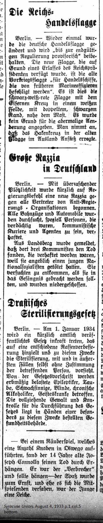 August 4, 1933 page 1 _____ Berlin. — Oncw again the German Merchant Flaf was altered and will remain "provisional pending final regulation." The new flag, which due to a decree by the Reich President, is the old prewar flag "for merchant ships previously commanded by former Marine Officers." It is the old black-whitepred flag with the Iron Cross on a white background with a double black border near the mast. There was no reason given for the change. One assumes that the Swastika on the old flag offended foreigners. Big Raid in Germany _____ Berlin. — With surprising suddenness a new raid on all representatives of anti-government organization was begun recently. All train cars and automobiles were searched; special people, who were suspected of being Communist couriers and agents were arrested. From Landsberg came the report that three Communists, who had been arrested were killed because they had allegedly murdered a young National Socialist. They attempted to escape as they were supposedly being brought to prison. They were shot and killed. Drastic Sterilization Law _____ Berlin. — On January 1, 1934 a recently introduced law will be put into effect, which aims at a decisive racial improvement. To this end the law provides for sterilization with, and in extreme cases without the consent of the individual. Provisions of the law will apply to people hereditarily burdened with epilepsy, deafness, feeble mindedness, blindness, chronic alcoholism, and mental illness. The full force of the law and control for the its enforcement lie in the hands of special healthcare authorities chosen for this purpose. |