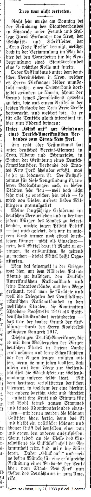 July 21, 1933 page 8 _____ Baseless pessimism within German societal life in Troy made it impossible for Mr. Birkmayer to establish a local association, it seems to be the reason for his staying away now, as an article in the last issue of the Troy Free Press indicates and which we, since it will be of interest to all Germans, print here: A truly baseless pessimism has apparently seized our German social groups in Troy, Albany, and Schenectady in the matter of the founding of a German-American Association of the State of New York and this is regretable. Enthusiasm for this new founding in our State is, based on our observations, embarassing — because not much will be achieved — so proclaimed many of our beloved fellow citizens. My many years of experience in German societal life and in the activities of all citizens of this country, perhaps called political duty, have taught me that we always accomplish something in this country not as individuals but through a medium — this is the means to gain power, exercise it, make it effective — this medium is called Organization. Back in the days of wartime rage, in to embrace Allies Patriotism, the German-American National Bund and its State associations moved aside because people feared them and because the delegates of the German-American National Bund in the western states hindered the nomination of Theodore Roosevelt in 1916 as a presidential candidate. That was the real reason for the dissolution — the 1917 Congress made docile by Roosevelt.* Those German-Americans, who are seriously concerned with the wellbeing of citizens of German blood in this country and who do not wear blinders and just look around they will see that the only way to carry weight is to assert ourselves. With the currently splintered German element, in which one side marches forward and the other side lags behind instead of using their power and advocating for the good of the entire race and their adopted fatherland — the clever politican is skilled in this art and uses this trick to play one side against the other. When the resolve of the collective replaces the will of the individual we become stronger. Therefore "Good Luck!" and my best wishes for the sucessful founding of an Association of Germans in the State of New York to benefit the German community and all of America. _____ [*Translator's Note: The first two of three obituaries for Theodore Roosevelt helps explain why German-Americans disliked him. See Roosevelt Obituaries-January 9, 1919] |