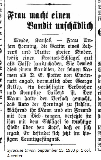 September 15, 1933 page 1 _____ Meade, Kansas. — Mrs. Anson Horning, the wife of a teacher and mother of two children, knows well how to use a croquet mallet as a weapon. She proved this to a bandit who gave his name as D.E. Potter of Cincinnati but was in reality George Kelley, a notorious criminal and accomplice of Bailey's. The man made an attempt to steal Horning's auto. While her husband and a friend struggled with the thief, she gave him such a blow over the head with the mallet that he surrendered. He's currently in the local county jail. ____ A fuller and more accurate account of the event can be seen at Gunman Taken by Croquet Players |