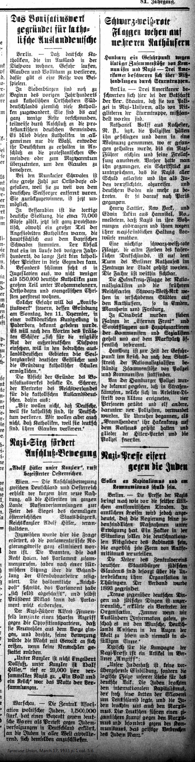 March 17, 1933 page 1 _____ Even at the beginning of the last century many South German Catholics emigrated to Transylvania. For the most part they have disappeared due to their joining German Protestant denominations. These Catholics had only two choices, either stay with the German community and join a Protestant sect or move to a Magyar community to retain their faith. In Munkac, Swabia a large number fell into Orthodoxism because they were too far from a German pastor. It's now impossible to win them back. In Bessarabia German settlements containing around 70,000 people are almost all Protestants now. A large portion of them were originally Catholics from Bavarian Swabia. The decline came during the last century because there were no German priest in the region. Things are especially bad in Yugoslavia where no fewer than 550,000 German Catholics for the most part live scattered among the Islamic, Orthodox, and Evangelical Christian sects. The Boniface Association wants to navigate through such peril. Its founding was proclaimed in a German announcement in Paderborn on Sunday, Decembe 11th. According to Prelate Schäfer the association "will commit itself to the religious needs of Germans scattered abroad during the diaspora. It will enable the spiritual work of German clerics in the threatened German foreign regions and establish Catholic schools." Dr. Scherer, representative of the Reich Association for German Catholics Living Abroad, expressed the intentions of the founders of the Boniface Association as follows: "We do not want Germans to lose their German identity because they are Catholic. But we also do not want Catholics, because they are German, to lose their faith." Nazi Victory encourages Annexation Movement _____ "Adolf Hitler, Our Chancellor" shout Enthusiastic Austrians Vienna. — The annexation movement between Germany and Austria recently received new fuel as the Hitlerites held mass assemblies throughout the country in celebration of the victory of the former Austrian citizen, Reichs Chancellor Adolf Hitler. Meanwhile the question has been raised whether the parliamentarian system of government has been completely eliminated. The officials, who have the right to call for a session in Parliament, have resigned after a stormy session over the handling of tbe railroad workers. The semi-official Reichspost writes that Parliament may have "abolished itself." Even President Miklas cannot call Parliament into session. Nazi leader Alfred Frauenfeld launched a sharp attack on the opposition parties, stating that they were avoiding a new election and he threatened that his movement would sieze power by force if a new election is not held. "Our Chancellor is not Engelbert Dollfuss; our Chancellor is Adolf Hitler," he shouted to the 20,000 assembled Nazis. "One people and one nation" was the motto at the assembly. Warsaw. — The Central Association of Polish Jews, 3,500,000 strong, called for a boycott on German goods in protest against Jewish persecution in Germany and appealed to Jews around the world to join them and do the same. Black, White and Red Flags flying from Many Townhalls _____ Hamburg a Dangerous Place due to Bloody Conflicts between Communists and Nazis — Three Americans complain about Mistreatment by the Stormtroopers Nathaniel Wolff of Rochester, N.Y. reports that the policemen hit him and then took him to a residence where he was held prisoner until a Nazi leader appeared and ordered his release. Previously a man forced him to sign a document exonerating the Nazis of any wrongdoing and obliging him to leave the German country as a Jew and never to return. He set off for Paris. Henry Sattler, New York and Edwin Dakin of Hannibal, Mo. reported that Nazis broke into their residences and accused them of anti-Nazi sentiments. A huge black, white and red flag, the old colors of the German Kaiser, is flying on the tower of the Berlin City Hall in the center of the city. The flag is visible from afar. The Swastika flag of the National Socialists and the earlier imperial black, white and red colors are flying in various cities on their town halls, including Emden, Mannheim and Freiburg. In Osnabruck the seven flags of the "Iron Front" and Soviet flags are raised at the headquarters of the Communists and Socialists and publically burned in the marketplace. Hamburg is currently a dangerous place in the nation since the Nazi coup has led to constant conflicts between police and Communists. The Hamburg Police announced that in street fights taking place in the worker's district of Altona, four people were killed and eleven others wounded, among them four policemen. The unrest began when "Brownshirts" hoisted their swastika onto the town hall and members of the Hitler Party and police exchanged gunfire. Nazi Press crusades against the Jews _____ Supposedly to blame for Capitalism and Communism Berlin. — The Nazi Press is exhibiting more antisemitic tirades than ever before. In official circles it's intimated that the government is not contemplating any antisemitic measures. One factor in the situation might be the German National members of the Cabinet, which allegedly condemns any form of antisemitism. The leaders of the Central Association of German Citizens of Jewish Faith are fearful of the suppression of their organization in Thuringia. The association was established in 1893. "Fidelity to German and Jewish things is inseparable," a representative of the organization stated. "Whenever we gave information to foreigners it happened in accordance with Germany's wish to raise its reputation in the eyes of the world and never in a derogatory manner." Here is an article from the Berlin newspaper Angriff typical for the campaign of the Nazi Press: "Our hatred of Jews is no passing fancy but the logical conclusion of our love for the German people. The Jews brought international Capitalism which brazenly placed the chains of slavery on Germany, and the Jews also brought u