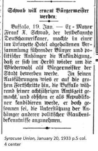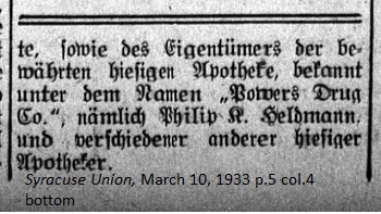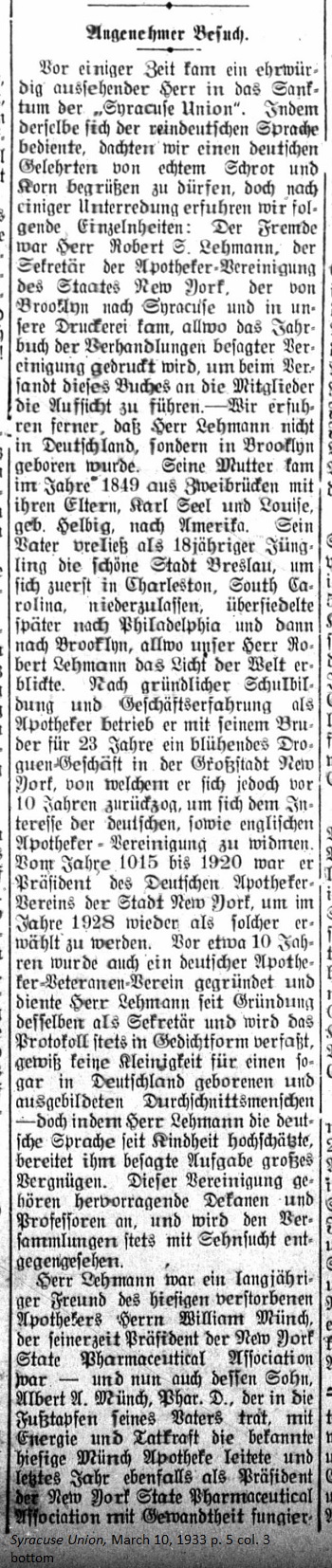 March 10, 1933 page 5 _____ A while ago a respectable looking gentleman came into the sanctum of the Syracuse Union. Since he possessed true skill in the use of the German language, we thought we might be greeting an educated man of true German stock. After a brief conversation we learned the following: The stranger was Mr. Robert S. Lehmann, the secretary of the Pharmacist Society of the State of New York, who came from Brooklyn to our print shop in Syracuse to have the Society's yearbook of proceedings printed. The book would be distributed to its members. We further learned that Mr. Lehmann was not from Germany but born in Brooklyn. His mother came from Zweibrücken to America in 1849 with her parents, Karl Seel and Louise, neé Helbig. As a young man of 18 years his father left the beautiful city of Breslau, settling first in Charleston, South Carolina. Later he moved to Philadelphia and then Brooklyn, where our Mr. Robert Lehmann first saw the light of the world. After receiving a thorough education with business experience as a pharmacist, he and his brother operated a thriving drugstore business for 23 years in New York City, from which he retired 10 years ago in order to dedicate himself to the interests of the German and English-speaking Pharmacy Society, From 1915 to 1920 he was president of the German Pharmacists Association of the State of New York and was reelected to the post again in 1928. Around 10 years ago a German Pharmacist Veterans Association was established and Mr. Lehmann has served as its secretary since its founding. He records the minutes of meetings, no small task even for an average man born and educated in Germany, but since Mr. Lehmann highly esteemed the German language since childhood, this task gave him great satisfaction. Illustrious faculty deans and professors belong to this society and meetings are always inspiring. Mr. Lehmann was a longtime friend of the local pharmacist, the late William Münch, who was in his day president of the New York State Pharmacuetical Association — and now his son, Pharm. D. Albert A. Münch, following in his father's footsteps, is actively managing the well known, local Münch Pharmacy. Last year he skillfully functioned as president of the New York State Pharmaceutical Association together with the owner of the pharmacy known under the name "Powers Drug Co., namely Philip R. Heldmann and several other local pharmacists. |