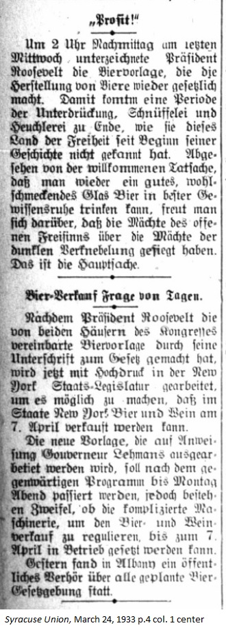 March 24, 1933 page 4 _____ At 2 PM last Wednesday President Roosevelt signed the Beer Bill, which makes the manufacture of beer legal again. Thus comes the era of oppression, snooping and hypocrisy, unknown in any other era in the history of this land of the free, to an end. Besides the fact that one can again have a good tasting glass of beer in good conscience, one can also rejoice that the powers of public liberalism have triumphed over the powers of dark obfuscation. This is the main issue. Beer Sale Question of the Day _____ Since President Roosevelt signed the bill submitted by both Houses of Congress, which made beer legal again, now the New York State Legislature will have to work at top speed to make it possible to sell beer and wine by April 7th. The new bill, which will be drawn up under Governor Lehmann's directive, is scheduled to be passed Monday evening, however there are doubts as to whether the complicated mchinery to regulate the sale of wine and beer can be set in operation by April 7th. In Albany yesterday a public hearing concerning all planned beer legislation took place. |