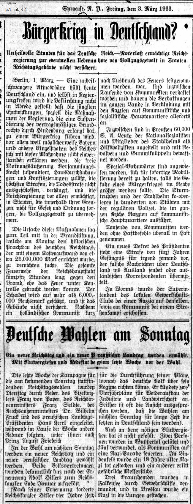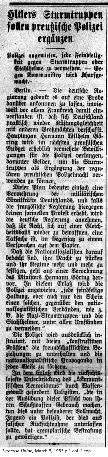 March 3, 1933 page 1 _____ Ominous Hourse for the German Reich — Emergency Ordinance Authorizes Reich Government to eventual Takeover by Executive Power in the States — Reichstag Building not insured. _____ The reason for these measures lies in part with the arson committed on Monday to the historic and magnificent building which houses the German Reichstag, which was constructed at a cost of 25,000,000 Marks. The entire Fire Department of the capital city battled the blaze for many hours before the fire could be contained. Damage is estimated at more than 6,000,000 Marks and the building is not insured. A Dutch Communist was arrested shortly after the outbreak of the fire. In the interval thousands of Communists were arrested and endured imprisonment throughout the nation in connection with raids on Communist and Socialist headquarters. In the meantime 60,000 National Socialist Storm Troopers and members of the Steel Helmets were appointed auxiliary policemen in Prussia and were armed with revolvers and rubber truncheons. Special railway attendants have been instructed to wait in reserve for immediate mobilization in the event that danger arises of a civil war in Germany. Storm Troopers and Steel Helmets are cooperating in hundreds of cities with the regular police, who have carried out raids on Communist headquarters throughout the nation. Thousands of Communists were taken into custody without arrest warrants. A new decree by the President calls for a punishment of five years in prison for anyone who sends false reports about Germany abroad or communicates with foreign correspondents. In Worms the Superintendent of the local trade union club was shot during a raid, as was one Communist during a street fight. _____ A New Reichstag and a New Prussian State Parliament will be elected — The Last Week before the Election began with Bloodshed and Rhetoric _____ Next Sunday's election will select a new Reichstag and a new Prussian State Parliament. Both parliaments were recently dissolved after the appointment of Adolf Hitler as Reich Chancellor at the end of January. (After his appointment Reich Chancellor Hitler requested four years to carry out his plans. Thereafter the German people can judge his regime. He announced two four-year plans for the rebuilding of industry and agriculture. Since that time the opinion has often been expressed that Sunday's election will be the last one in Germany.) And there has been no lack of the necessary bloodshed. Two people were killed in Wuppertal and five wounded as Communists fired into a Nazi parade. In Lindenfels an eighteen year old Nazi was fatally stabbed and another suffered serious knife wounds. Three brownshirts were wounded by rifle fire in Falkensee and in Breslau one Nazi was stabbed in the lungs. |
