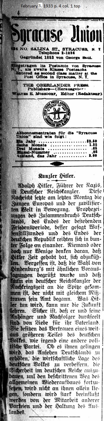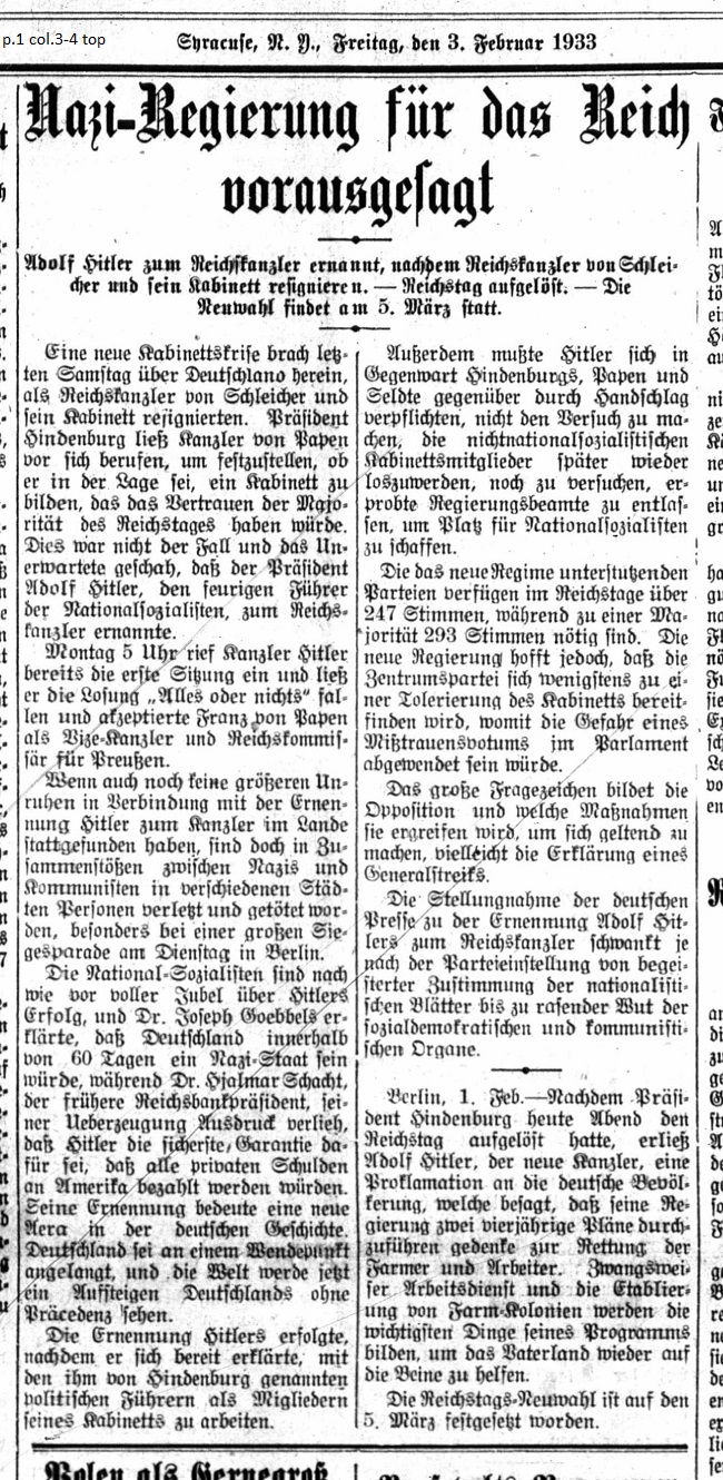 February 3, 1933 page 1 _____ Adolf Hitler to be appointed Reichs Chancellor after Reichs Chancellor von Schleicher and his Cabinet resign — Reichstag dissolved — New Elections take place March 5th _____ A new Cabinet crisis befell Germany last Saturday as Reichs Chancellor von Schleicher and his Cabinet resigned. President Hindenburg called on Chancellor von Papen to establish whether he was in a position to build a Cabinet in which the majority of Parliament would have confidence. This was not the case and the unexpected happened as the President appointed Adolf Hitler, the fiery leader of the National Socialists, to the post of Chancellor. Monday at 5 o'clock Chancellor Hitler already called for the first meeting and issued the slogan "All or nothing" and accepted Franz von Papen as Vice-Chancellor and Reichs Commissar for Prussia. While there were no large signs of unrest in the nation with the appointment of Hitler as Chancellor, there were clashed between Nazis and Communists in various cities where people were injured or killed, especially at the large victory parade Thursday in Berlin. The National Socialists are more then ever before jubilant with Hitler's victory, and Dr. Jospeh Goebbels stated that Germany would be a Nazi State within 60 days while Dr. Hjalmar Schacht, former Reichs President, expressed his conviction that Hitler would be the surest guarantee of all private debts being repaid to America. His appointment means a new era in German history. Germany is reaching a turning point, and the world will now witness an unprecedented ascension. Hitler's appointment followed his previous statement that he would work with political leaders appointed by von Hindenburg as Cabinet members. Additionally Hitler vowed with a handshake in the presence of Hindenburg, Papen and Seldte not to make any attempt to get rid of the non-National Socialist Cabinet members at a later date or to dismiss any time-tested government officials to create postings for National Socialists. The new regime of supporting Parties has over 247 votes in the Reichstag but it takes 293 votes to form the necessary majority. The new government therefore hopes that the Central Party will at least show tolerance for the Cabinet, thereby avoiding the danger of a "no confidence" vote in Parliament. The Opposition is the big question mark. What measures will it take to maintain its influence, perhaps call for a general strike? The positions taken by the German Press to Adolf Hitler's appointment fluctuate according to the political leanings from enthusiastic approval by the Nationalist newspapers to wild rage by the Social Democratic and Communist newspapers. Berlin. February 1st. — After President Hindenburg dissolved the Reichstag this evening, he permitted Adolf Hitler, the new Chancellor, to issue a proclamation to the German people, which stated that his government intends to carry out two four-year plans to save the farmer and the worker. Compulsory work service and the establishment of farming colonies will be important components of his program to help the fatherland get back on its feet. The new Reichstag election is scheduled for March 5th. |