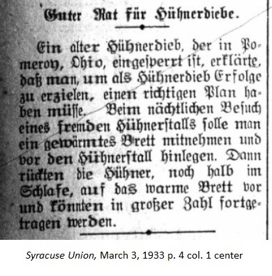 March 3, 1933 page 4 _____ An old chicken thief imprisoned in Pomeroy, Ohio stated that anyone aiming to become a successful chicken snatcher must have a proper plan. During a nightly visit at a unfamiliar chicken coup one should take a warmed wooden plank and place it in front of the coup. While still half asleep, the chickens move towards the warm plank and can be carried off in great numbers. |