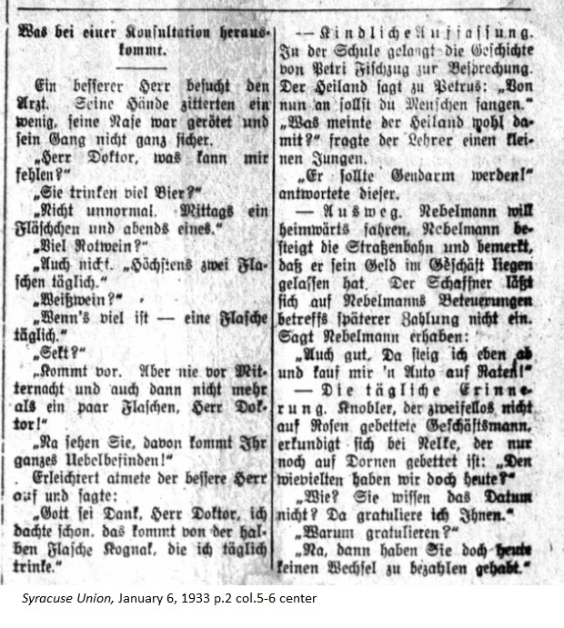 January 6, 1933 page 2 _____ A financially well-off man visits the Doctor. His hands shake a little, his nose is red and his gait is rather unsteady. "Herr Doctor, what's wrong with me?" "Do you drink a lot of beer?" "Nothing abnormal. A bottle in the afternoon and one in the evening." "Much red wine?" "Also not much. At most two bottles a day." "White Wine?" "At most, a bottle a day." "Champagne?" "On occasion, but never before midnight and no more than a couple bottles, Herr Doctor." "No wonder you find yourself so unwell!" The well-off man breathes easier and says, "Thank God, Herr Doctor. I thought it came from the half bottle of cognac I drink each day." _____ — A childlike concept. The story of the Apostle Peter is discussed in school one day. The Savior said to Peter, "From today onward you shall be a fisher of men." "What did the Savior mean by that?" the teacher asked one little boy. "He should become a policeman!" the boy responded. _____ A businessman wants to get home but as he reaches the streetcar he notices he left his money in his office. Despite the businessman's assurance that he'll pay later, the conductor refuses to let him on. The businessman says in a calm manner, "That's okay. I'll just get off and go buy an automobile on the installment plan!" |