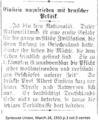 March 31, 1933 page 4 _____ The coming months will prove whether the distortion of thr real facts in the so-called persecution of Jews in Germany has brought more harm than good to German Jews. Without examining the outrageous lies closer, which in this case are not just being spread here but around the entire world, it's right to ask the question of whether their broadcasting was or was not a tactical error. Hitler's Party has claimed that a large portion of the Jewish community is internationally and solidly connected. The world has now delivered proof that the claim is correct. This was grist for the Nazi mill and scarcely contributes anything to change their resolution of driving the Jewish people of Germany out of numerous top-ranking positions they currently occupy. This in no way involves antisemitic persecution in the religious sense. Nonetheless it does and remains undemocratic, intolerant, and in direct opposition to the American concept of equality and liberty for all. _____ Hitler Strikes Back _____ The reports on the alleged persecution of Jews in Germany multiply day by day. First the propaganda wave here, then the proof of falsehood there; then inciting economic boycott abroad, followed by the Nazi government's boycott declaration against the Jews in Germany. The last action may be explained in light of the Nazi state of mind, which sees in their political agenda the saving of Germany from slavish oppression when a skilled diplomatic chess move was not certain. In contrast, the prescribed sanctions for boycott of Jewish doctors, lawyers, and business houses, as well as the limitation of study options among Jewish children will certainly be used by numerous opponents of Germany abroad as new proof for the continuation of propaganda. The measures also don't correspond with fundamental principles of tolerance and freedom of action which have existed in German life for decades. Protest Assembly was quite tame _____ The protest assembly in New York against alleged Jewish persecution in Germany, announced with great screams and loud fanfare, proceeded quite tamely. The visit met expectations and the majority of the planned speakers showed up, but the proper momentum was not achieved. It got lost as official data established that the reports concerning Jewish persecution were strongly exaggerated. Thus one had to limit the accusations to actual facts, which indcate that the Jewish community in Germany will have to endure certain restrictions in the future. The majority of speakers at the protest assembly extolled high praise on the German people and emphasized that the protest was not directed against them. Al Smith spoke freely and openly that they did not know what it actually dealt with; it was a protest in general against any form of oppression in personal freedom. Governor Lehmann was held back by pressing government business and could not attend the assembly. Hitler's name was hissed every time a speaker mentioned it. |