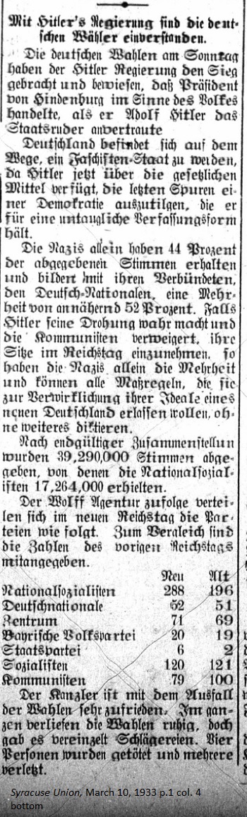 March 10, 1933 page 1 Germany finds itself on the path to becoming a Fascist state since Hitler currently uses legal means to obliterate the last traces of democracy, which he considers an ineffectual form of constitution. The Nazis alone received 44 percent of ballots cast and joining with their allies, the German Nationals, it achieved a majority nearing 52 percent. In the event Hitler stands by his threat and denies the Communists their seats in the Reichstag, then the Nazis alone will have a majority and will be able to dictate any measures they deem appropriate to realize their idea of a new Germany. After the final tally 39,290,000 votes were cast, of which the National Socialists received 17,264,000. The Wolff Agency distributed the parties in the new Reichstag as follows. In comparison the numbers for the prior Reichstag are given.