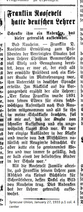 January 27, 1933 page 1 _____ Gave Him a Memento as a Keepsake Bad Nauheim. — Franklin D. Roosevelt's election to the presidency of the United States filled teacher Christian Bommerschein with pride and satisfaction, for it was he who gave him German language instruction when the president was a small boy in a sailor suit. Looking back to the past, the old teacher related: "In 1891 young Franklin was taken to Bad Nauheim for a six week stay by his parents. When they brought him to my classroom it occurred to me that the boy had quick skills of comprehension and he was unusually clever. He was the only foreigner in the class and naturally he was viewed with curiosity by his fellow students. But he had such winning ways and was always so pleasant that he soon became one of the favorite children in the school." When the Roosevelt family left, as a parting gift Franklin gave his teacher a small box for his quills, the top of which had a picture of Nauheim. The teacher faithfully preserved this as a keepsake. |